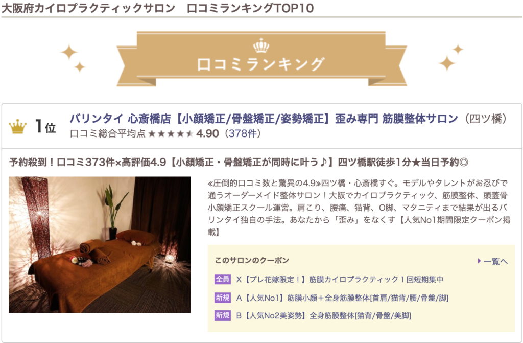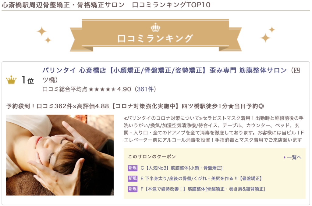 ホットペッパー【心斎橋 骨格矯正】口コミランキング1位