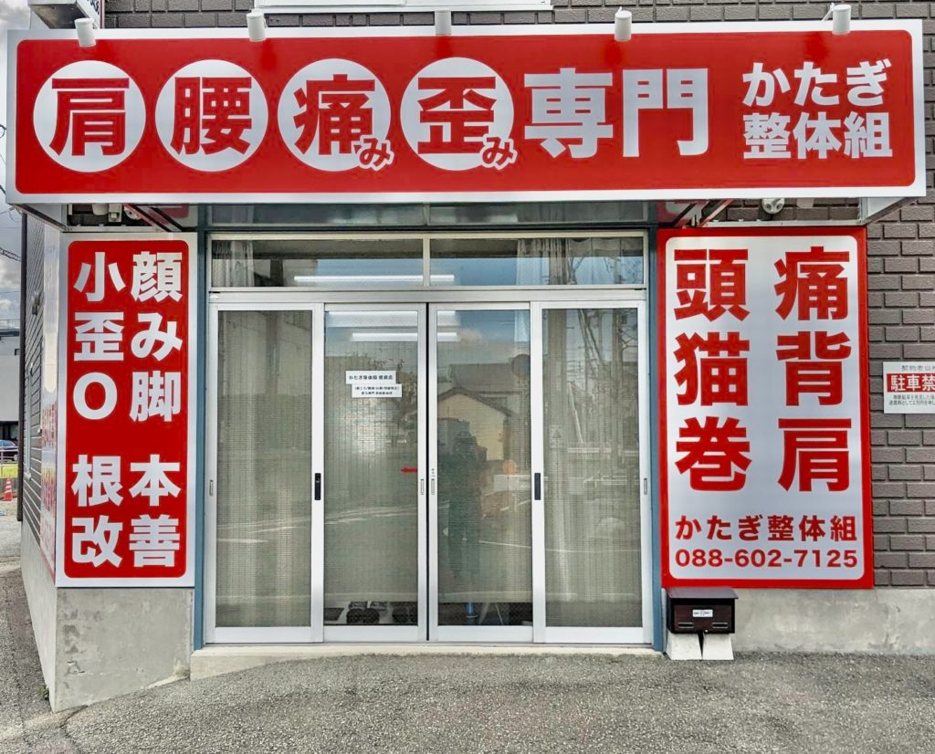 「かたぎ整体組 徳島店【肩こり/腰痛/小顔/骨盤矯正】歪み専門 筋膜整体院」です。